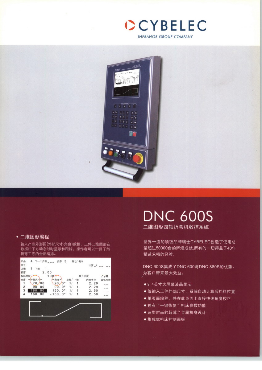 瑞士CYBELEC公司,成立于1970年,是一家專業(yè)開發(fā)鈑金數(shù)控系統(tǒng)并在該領(lǐng)域享譽(yù)全球的領(lǐng)頭羊企業(yè)。1970年,CYBELEC公司開發(fā)出全世界第一臺(tái)折彎?rùn)C(jī)數(shù)控系統(tǒng),1978年推出了具有劃時(shí)代意義的世界第一臺(tái)通過微處理器控制的數(shù)控系統(tǒng),使數(shù)控折彎?rùn)C(jī)實(shí)現(xiàn)了真正的電液同步。直到今天,這種電液同步技術(shù)仍然作為一種標(biāo)準(zhǔn)模式被行業(yè)內(nèi)所有機(jī)床制造商所采用。瑞士CYBELEC公司技術(shù)領(lǐng)先,實(shí)力雄厚,并不斷在技術(shù)上創(chuàng)新,為世界鍛壓數(shù)控自動(dòng)化做出了重要貢獻(xiàn)。40年以來,在全球已累計(jì)生產(chǎn)銷售50000多套CYBELEC數(shù)控系統(tǒng)。其產(chǎn)品主要面向:折彎?rùn)C(jī),剪板機(jī)等。