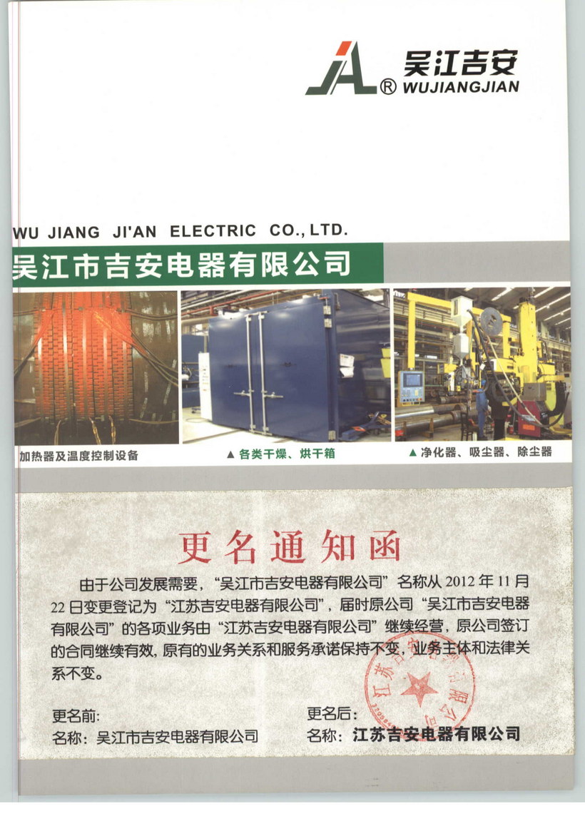 吳江市吉安電器有限公司是一家集科研和制造的高科技企業,企業座落于素有天堂美稱的蘇州城南吳江市經濟開發區龍橋路,距蘇嘉杭高速(W15)吳江南出口一公里,毗鄰上海、杭州。公司將憑借長三角的地利、經濟、人才優勢打造成一流的國際化企業。公司下設三大事業部:1、熱處理工程與設備事業部:主要生產用于熱處理工程所需的各類電加熱器,溫度控制箱,全纖維節能電爐,及熱處理工程所需的簡易電爐,并承接熱處理工程;2、干燥(烘烤)設備事業部:主要生產可編程智能烘烤箱,潔凈、充氮、真空、防爆等各類特殊要求的烘烤箱,以及電子行業的印刷板、電子電容器、LED光電元器件、單晶硅多晶硅石墨舟等生產工藝需求的專用烘烤箱;3、凈化工程與設備事業部:主要生產焊煙凈化器,工業吸塵器,袋式除塵器,并承接車間空氣凈化工程設計和安裝。