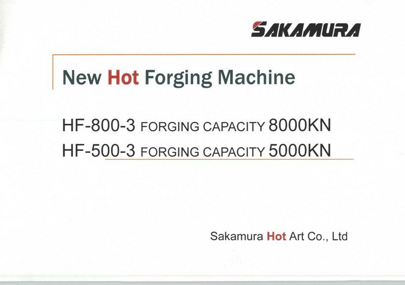 New Hot Forging Machine:HF-800-3 FORGING CAPACITY 8000KN、HF-500-3 FORGING CAPACITY 5000KN。