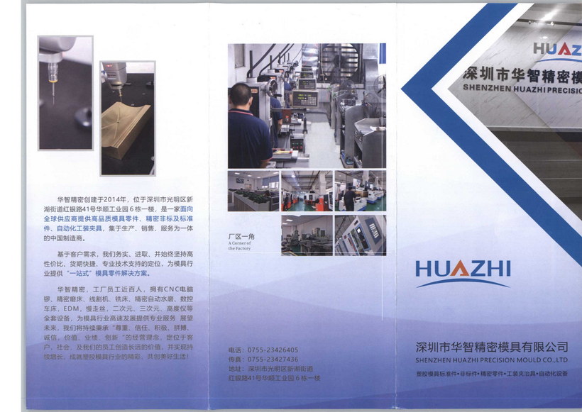 華智精密創(chuàng)建于2014年,位于深圳市光明區(qū)新湖街道紅銀路41號(hào)華順工業(yè)園6棟一樓,是一家面向全球供應(yīng)商提供高品質(zhì)模具零件、精密非標(biāo)及標(biāo)準(zhǔn)件、自動(dòng)化工裝夾具,集于生產(chǎn)、銷售、服務(wù)為一體的中國制造商。基于客戶需求,我們務(wù)實(shí)、進(jìn)取、并始終堅(jiān)持高性價(jià)比、貨期快捷、專業(yè)技術(shù)支持的定位,為模具行業(yè)提供“一站式”模具零件解決方案。華智精密,工廠員工近百人,擁有CNC電腦鑼、精密磨床、線割機(jī)、銑床、精密自動(dòng)水磨、數(shù)控車床,EDM,慢走絲,二次元、三次元、高度儀等全套設(shè)備,為模具行業(yè)高速發(fā)展提供專業(yè)服務(wù) 展望未來,我們將持續(xù)秉承“尊重、信任、積極、拼搏、誠信,價(jià)值、業(yè)績、創(chuàng)新“的經(jīng)營理念,定位于客戶,社會(huì),及我們的員工創(chuàng)造長遠(yuǎn)的價(jià)值,并實(shí)現(xiàn)持續(xù)增長,成就塑膠模具行業(yè)的精彩,共創(chuàng)美好生活!